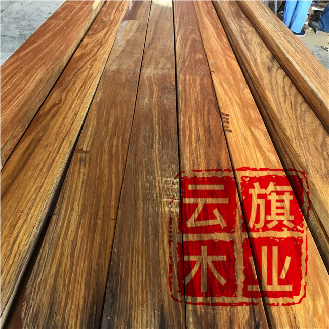 印尼菠萝格心边材区别明显,今朝木业有限边材淡黄白色至灰白色;心材红褐色至淡栗褐色,具深色带状条纹。生长轮略明显。散孔材,管孔大小中等;单孔及短径列复管孔,内含物丰富。轴向薄壁组织明显,呈环管状、翼状、少数聚翼状和轮界状、木射线细、甚多;径面斑纹不明显,弦面波痕未见。木材有光泽,天特殊气味和滋味;纹理交错,结构略粗,耐腐、耐久性强。材质硬重,强度高。此木材显著特征为管孔内硫黄色沉积物极为明显,遇铁及水易变色。